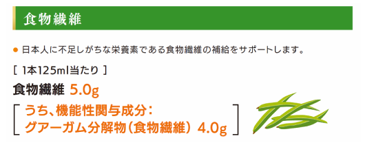 - 1本で食物繊維5.0g【うち、機能性関与成分:グアーガム分解物(食物繊維)4.0g】を補給することができます。